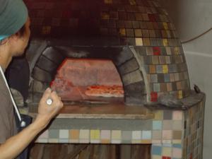 ピザ釜に薪を入れて短時間でピザを焼き上げます。やはり焼き上がりが違いおいしいピザに仕上がります。