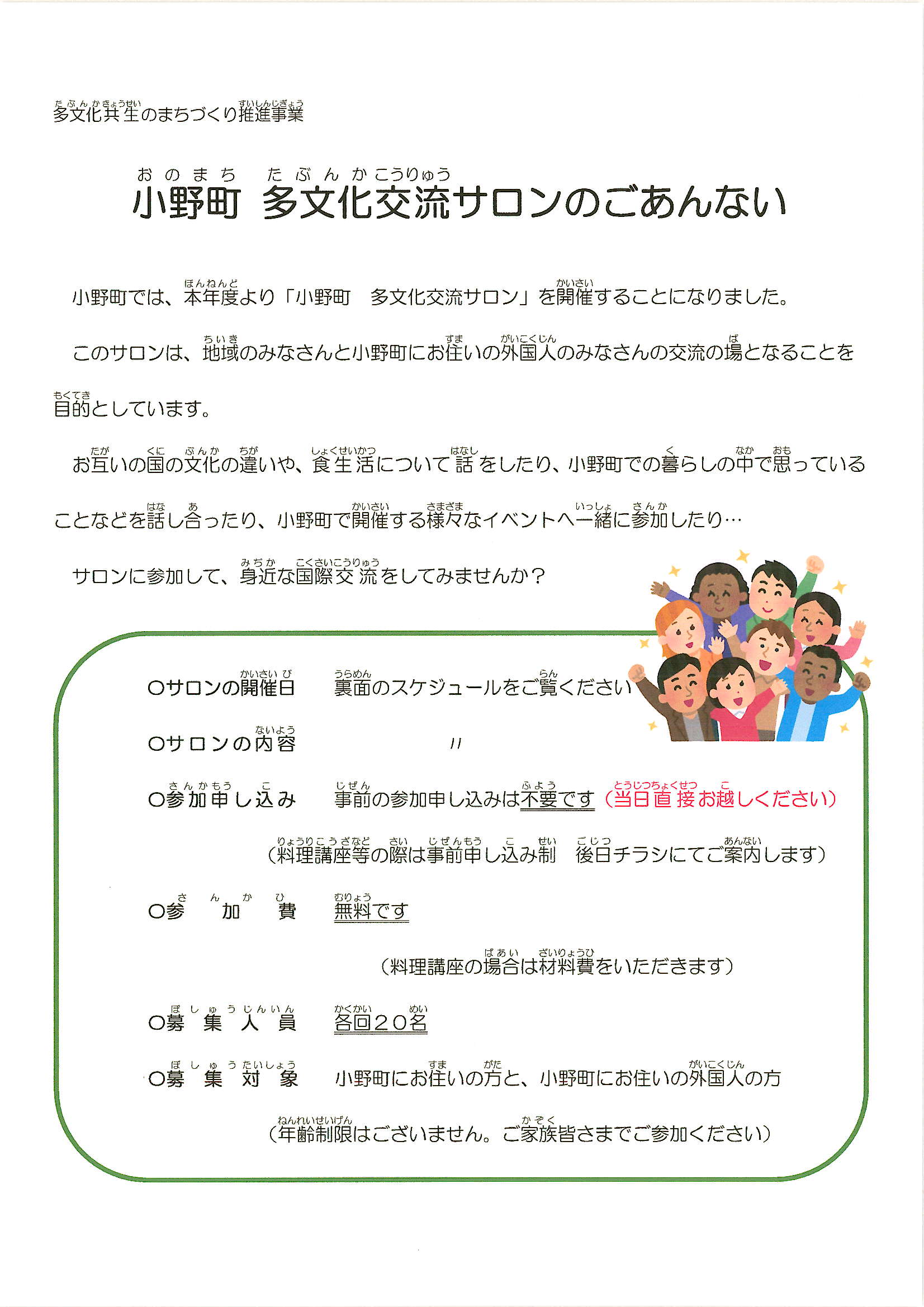 地域の皆さんと、小野町にお住まいの外国人の皆さんとの交流の場となることを目的として、「小野町 多文化交流サロン」を開催します。