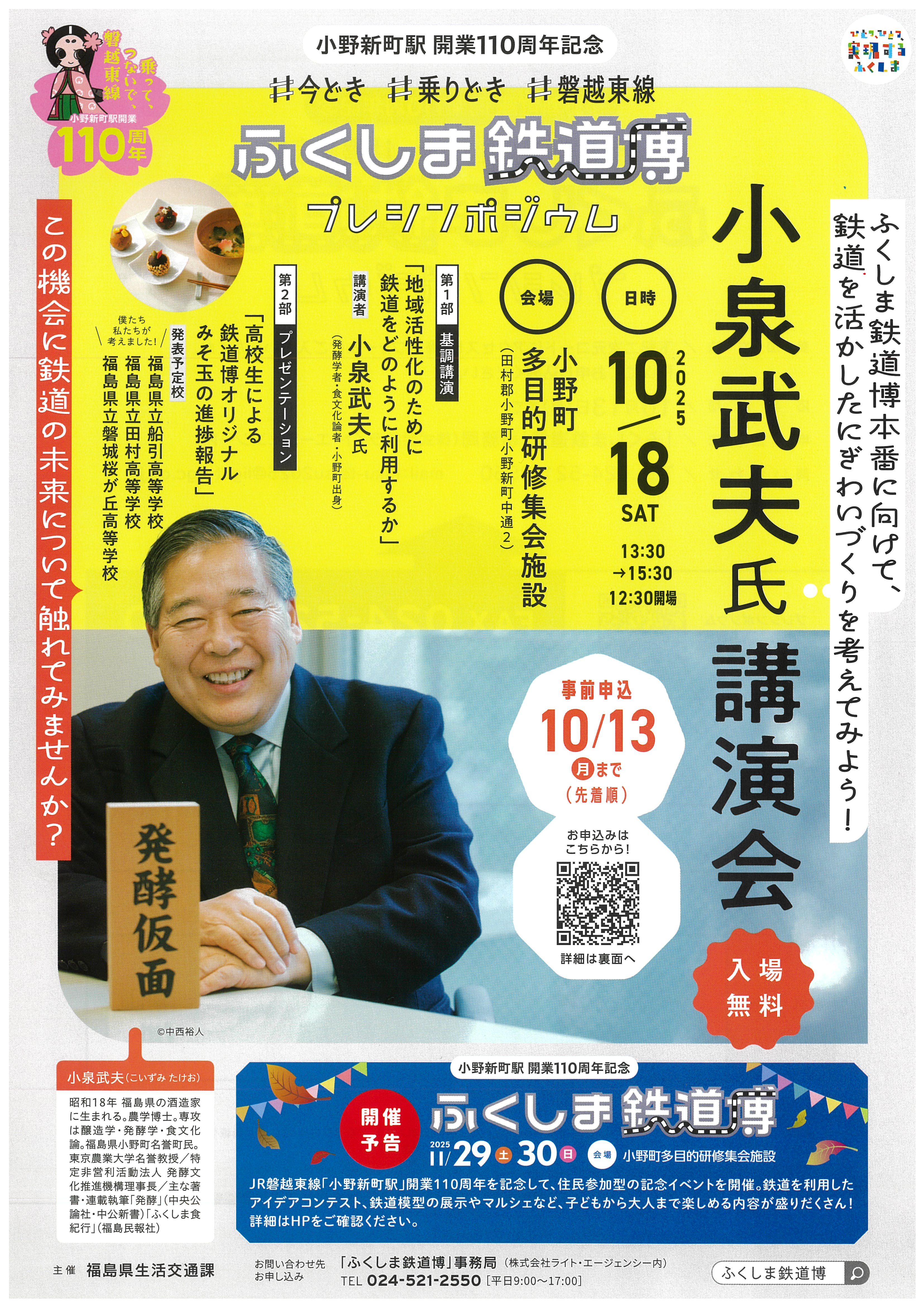 プレシンポジウムでは、当町出身の発酵学者である小泉武夫氏による地域活性化のための鉄道利用の講演や県内高校生による『鉄道博オリジナルみそ玉』の進捗報告が行われます。